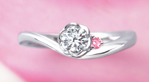 すらりと伸びる茎に咲く大輪の花、芍薬(シャクヤク)をイメージした婚約指輪です。なめらかなアームと大きく輝くダイヤモンドが印象的なデザインで、両サイドには幸せを象徴するピンク色の宝石が輝きます。