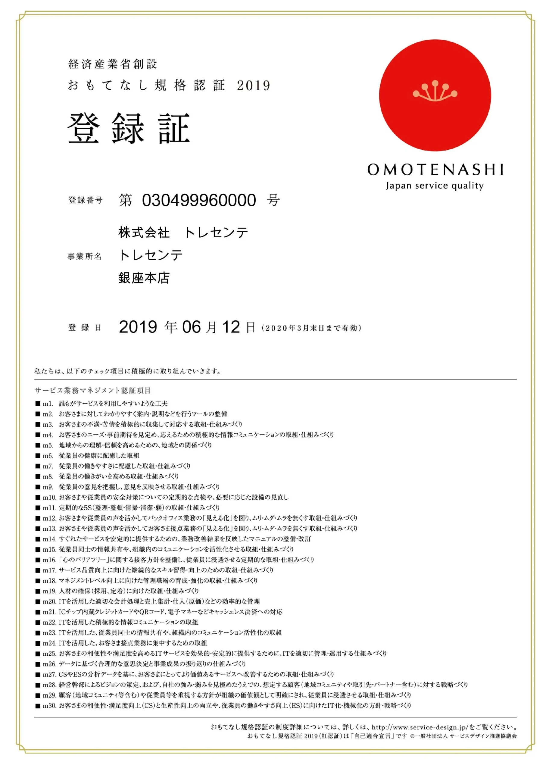において「おもてなし規格認証(紅認証)」を取得したことをお知らせいたします。
