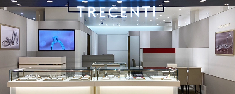 TRECENTI博多マルイ店はシックで落ち着いた店内のお店。今だけでなく100年先の未来まで大切に使えるジュエリーを扱うブランドです。