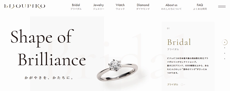 ブライダルジュエリーブランドはオリジナルの婚約指輪・結婚指輪を扱うブライダル専門のブランドです。豊富なデザイン・サイズ展開があり、選びやすいのが特徴。