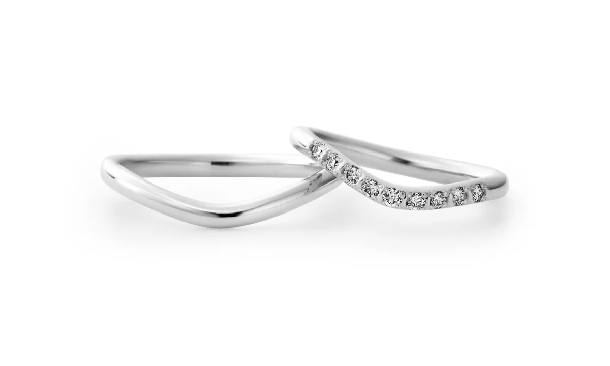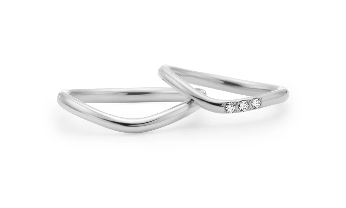 これから歩む道のりを表現したV字ラインの結婚指輪です。曲線に合わせて並ぶメレダイヤモンドは彫り留めでセッティングされており、引っ掛かりがありません。