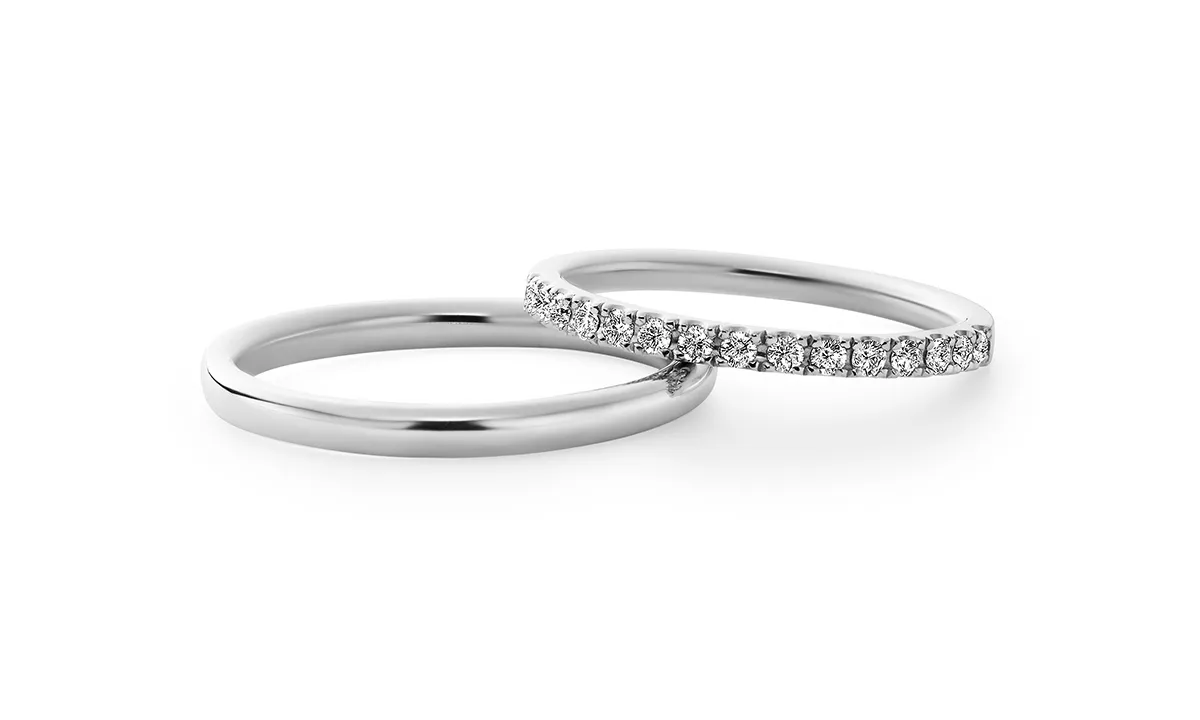一般的には女性側の指輪にダイヤモンドを多くあしらい、男性側はダイヤモンドを入れない、もしくは控えめにするケースが多いですね。