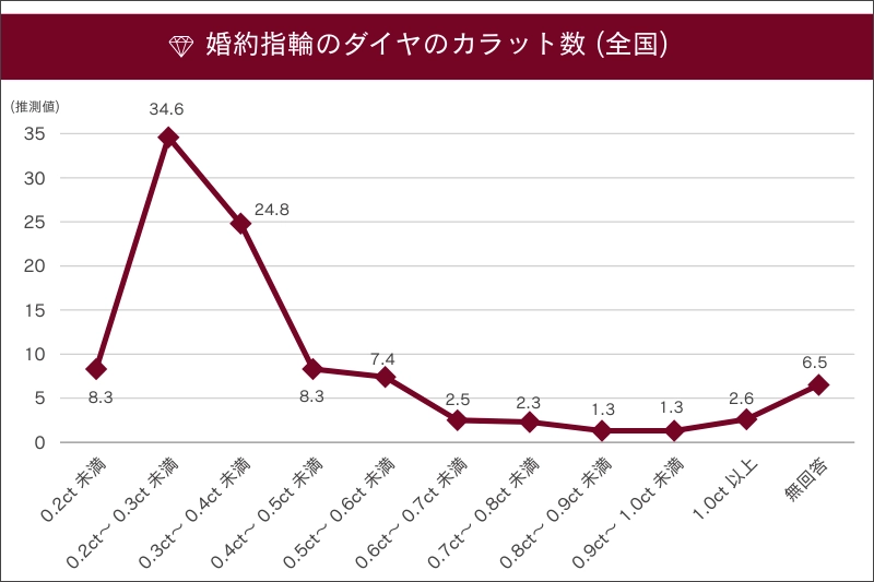 婚約指輪で選ばれているダイヤモンドの平均サイズは0.2〜0.3ct程度でした。0.2〜0.4ctのサイズがもっとも多く、全体の約50%を占めるボリュームゾーンです。